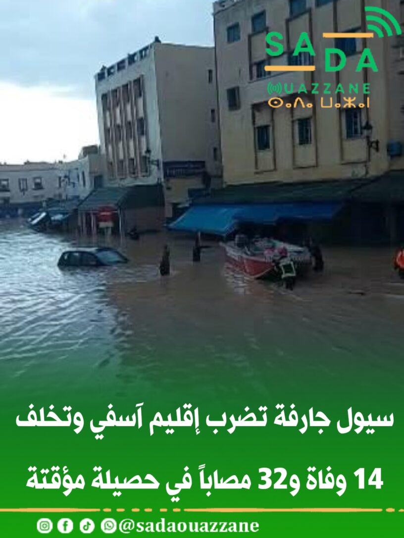 عرف إقليم آسفي، مساء الأحد، تقلبات جوية حادة وغير مسبوقة، تمثلت في عواصف رعدية قوية وتساقطات مطرية غزيرة، أدت خلال مدة زمنية وجيزة لم تتجاوز ساعة واحدة إلى تشكل سيول جارفة خلّفت حصيلة بشرية ثقيلة وخسائر مادية كبيرة. ووفق حصيلة مؤقتة صادرة عن السلطات المحلية، فقد أسفرت هذه الفيضانات المفاجئة عن وفاة 14 شخصاً، جراء اجتياح المياه لعدد من الأحياء السكنية وتسربها إلى داخل المنازل والمحلات التجارية، فيما أُصيب 32 شخصاً بجروح متفاوتة الخطورة، جرى نقلهم إلى مستشفى محمد الخامس بآسفي لتلقي العلاجات الضرورية تحت إشراف الطاقم الطبي.